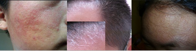 脂溢性皮炎,好发于皮脂腺分布较多的地方,如头皮、面部、胸部及皱褶部。开始为轻度潮红斑片,上覆灰白色糠状鳞屑,伴轻度瘙痒,皮疹扩展,可见油腻性鳞屑性地图状斑片;严重者伴有渗出、厚痂、有臭味,可侵犯整个头部。